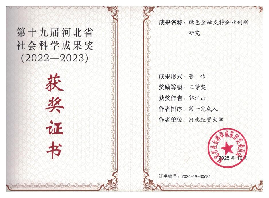 近日,河北省社会科学成果奖评审委员会颁发第十九届河北省社会科学成果奖,91社区郭江山副教授荣获第十九届河北省社会科学成果奖三等奖。